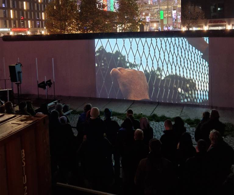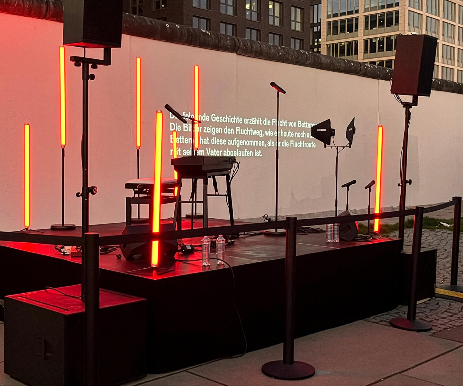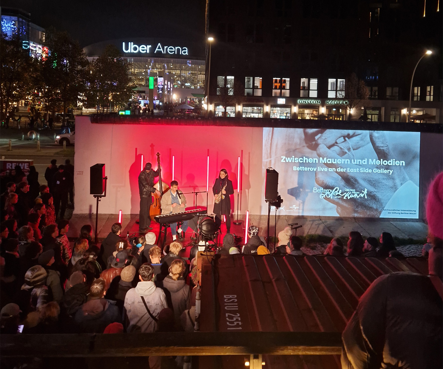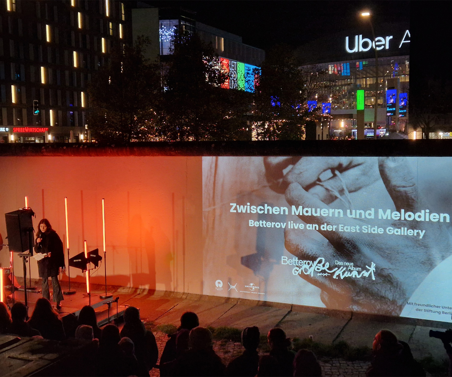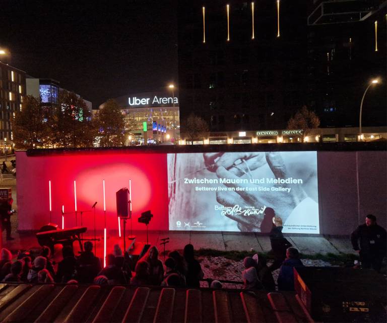 Zum Release seines neuen Albums lud Betterov gemeinsam mit Universal Music Germany zu einem besonderen Showcase an die East Side Gallery – direkt an der Spree, gegenüber der Uber Arena und auf das Gelände der Pizzeria Zola. Betterov, einer der spannendsten deutschsprachigen Künstler der letzten Jahre, verarbeitete in seinem Album die Fluchtgeschichte seines Vaters aus der DDR. Genau dieser Hintergrund machte den 9. November 2025 – den Tag des Mauerfalls – zu einem eindrucksvollen und emotionalen Datum für dieses Event. Auf die Mauer projizierte Bildinstallationen zeigten historische Motive und persönliche Aufnahmen, die den damaligen Fluchtweg seines Vaters dokumentierten. Das Showcase verband Konzert, Erinnerungskultur und persönliche Geschichte – ein Moment zwischen Musik, Zeitzeugnis und künstlerischer Inszenierung. Rund 250 Fans und 80 geladene Gäste waren vor Ort. phonux events übernahm den Full Service Veranstaltungstechnik – mit Licht, Bühne, Ton und Video. Wir sorgten dafür, dass Atmosphäre, Storytelling und Musik nahtlos ineinandergreifen konnten und der Abend die emotionale Tiefe erhielt, die er verdient.